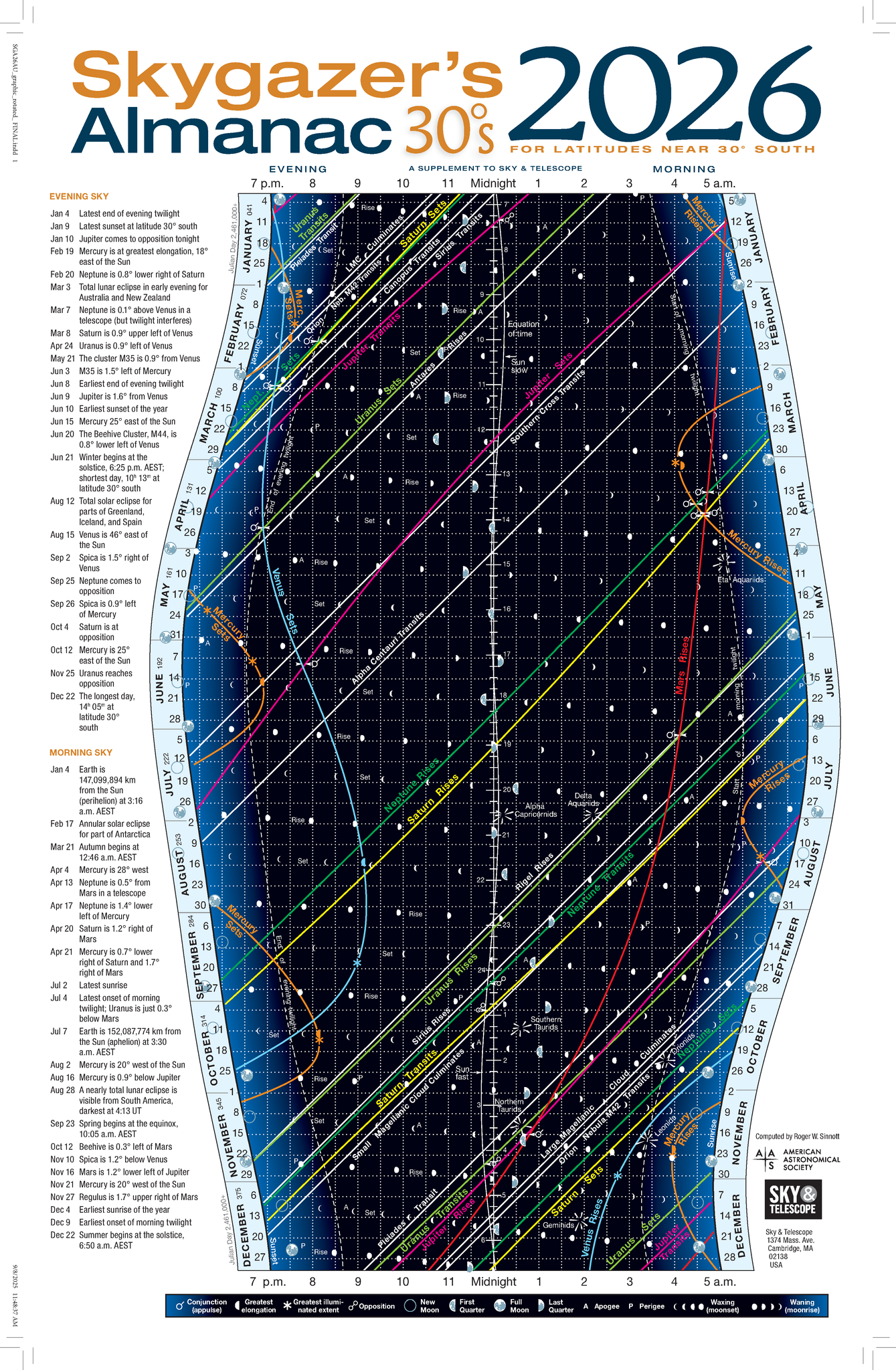 This almanac is plotted for astronomers near latitude 30 degrees South, which includes Australia, southern Africa, and the southern cone of South America.
